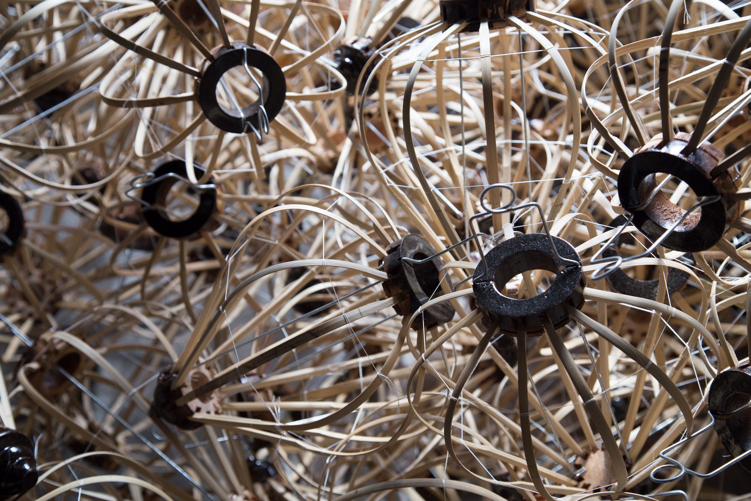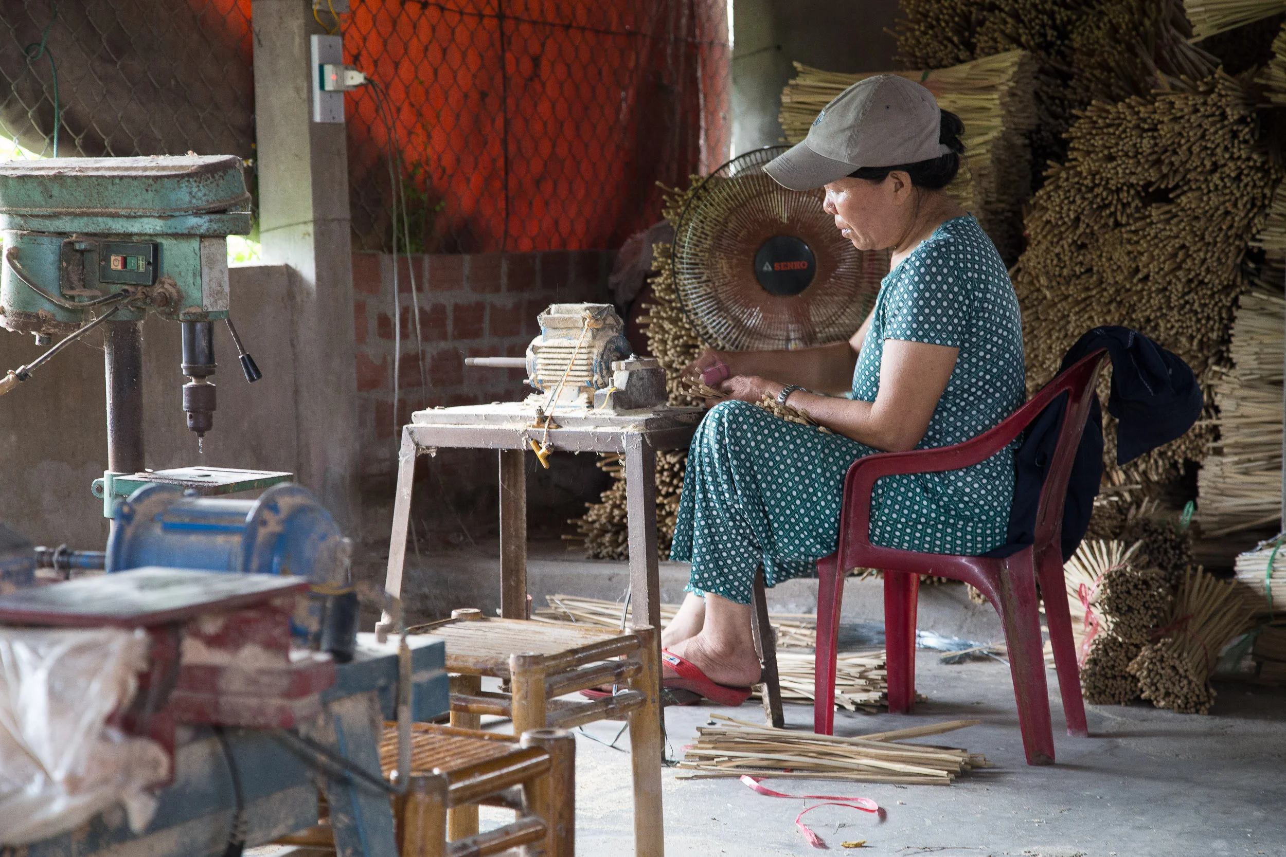 A worker constructing bamboo lantern frames at Hoi An's largest lantern factory, Ha Linh.