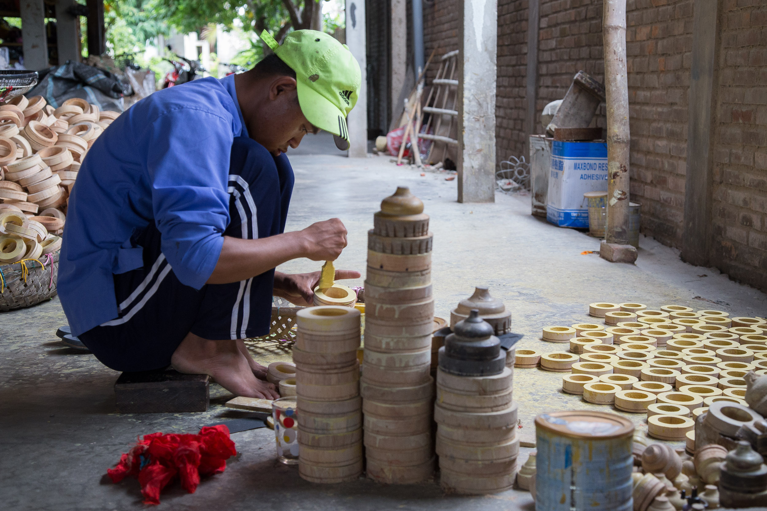 Inside we found about a dozen workers, busy at various stations. Some were constructing the bamboo skeletons, another was cutting grooves into the wooden discs that hold the structure together at the top and bottom, others were keeping an eye on daytime tv while they glued strips of colourful silk onto the frames. Each month, we are told, Ha Linh lantern factory makes more than 5,000 units. I negotiated some prices with the lady who ran the store and then said we’d shop around.