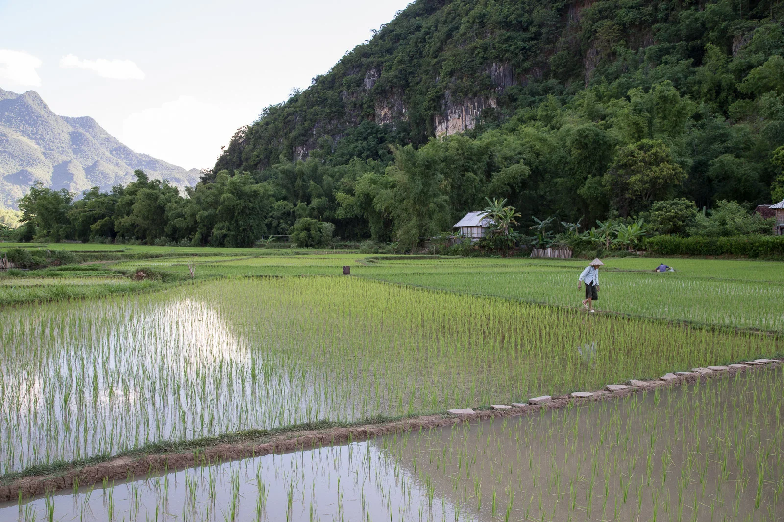 In the distance, we hear a rumble and dark clouds start to push in between two jungle-covered mountain peaks. Here in the lush valley of Mai Chau, three-and-a-half hours’ drive south-west of Vietnam’s capital Hanoi, a local White Thai family has drafted a handful of neighbours to help them plant out their rice paddies. As the last, almost luminous-green, young rice plants are slotted into place (each in a good year will yield about 140 grains) fat drops begin to fall from the sky. What soon becomes a steady soaking rain, hardly fazes the rice farmers, who stand in the government-built concrete water channels to wash dark red mud off their shins, like blood.